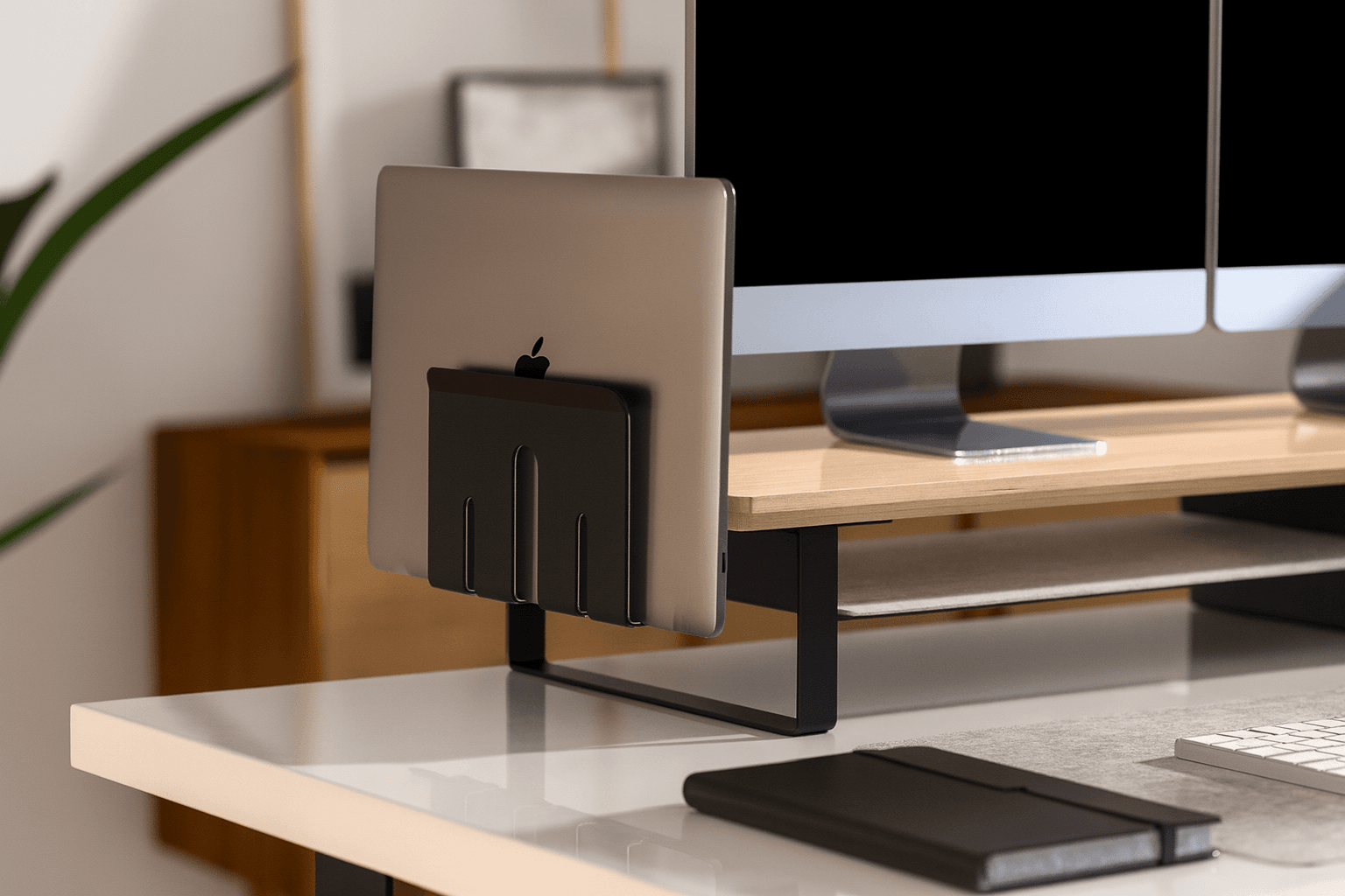 Organize your workspace and protect your laptop with the Metal Vertical Laptop Stand for Desk Mount. Crafted from premium powder-coated steel with a soft felt interior, this under-desk mount keeps your device upright, secure, and out of the way — freeing up valuable desk space while maintaining easy access. Suitable for MacBook, Dell XPS, Precision, Surface Book, and other laptops up to 18 mm (0.7″) thick.